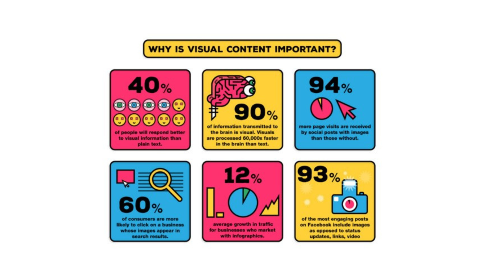 • 90% of the information transmitted to the brain is visual, and visuals are processed 60,000 times faster than text.